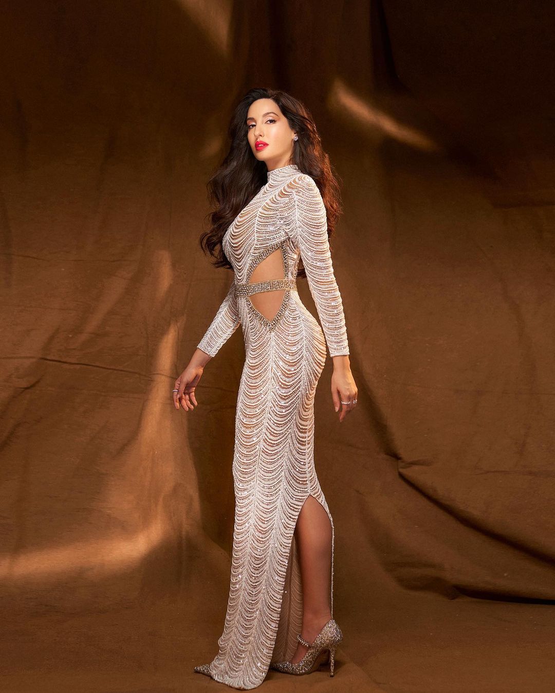 • Nora Fatehi looks fabulous in the silver-white cutout dress