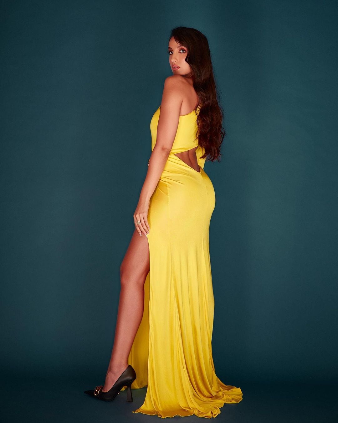 Nora Fatehi looks stellar in a yellow cutout dress.