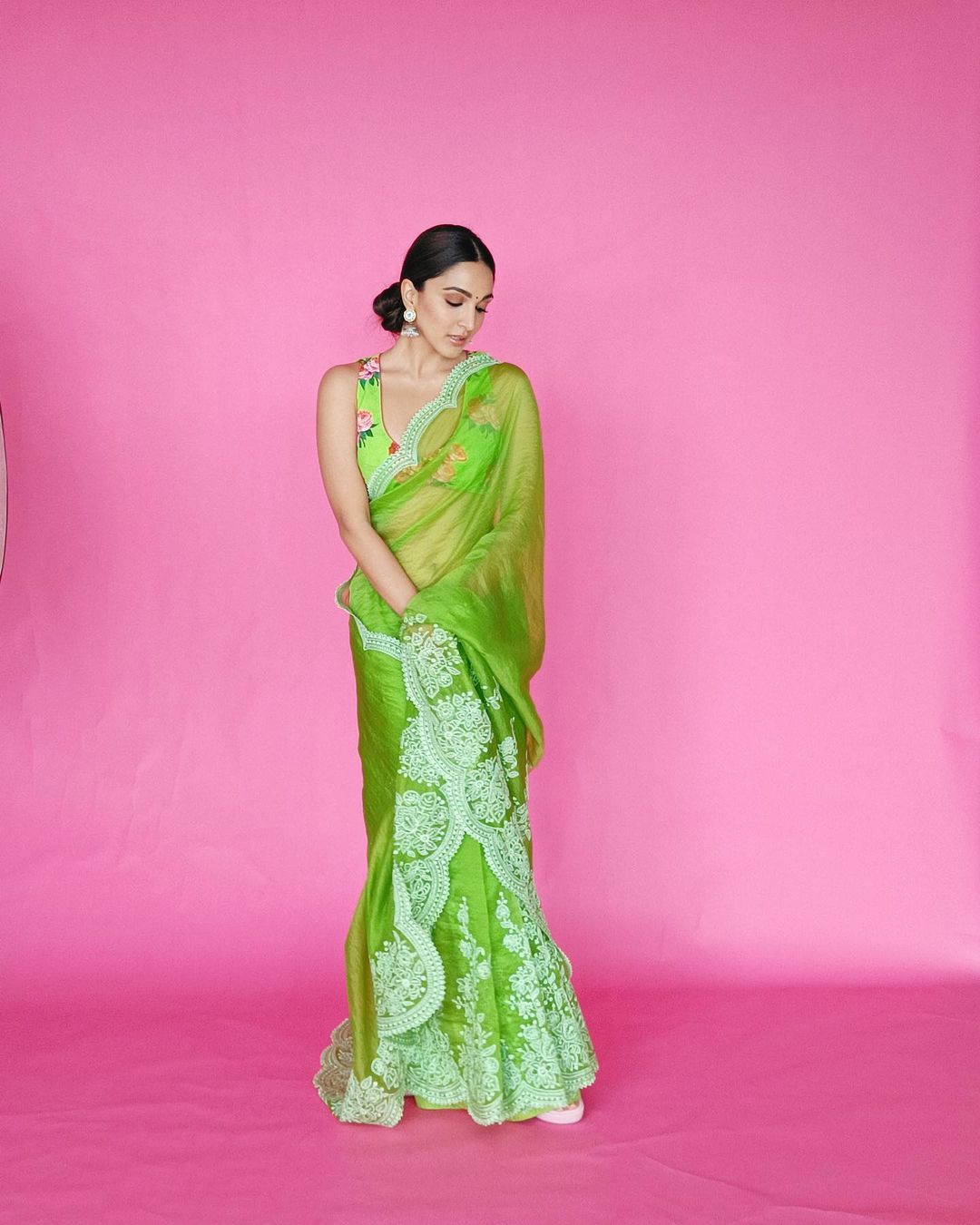 Kiara Advani looks graceful in the green scalloped saree with a floral blouse