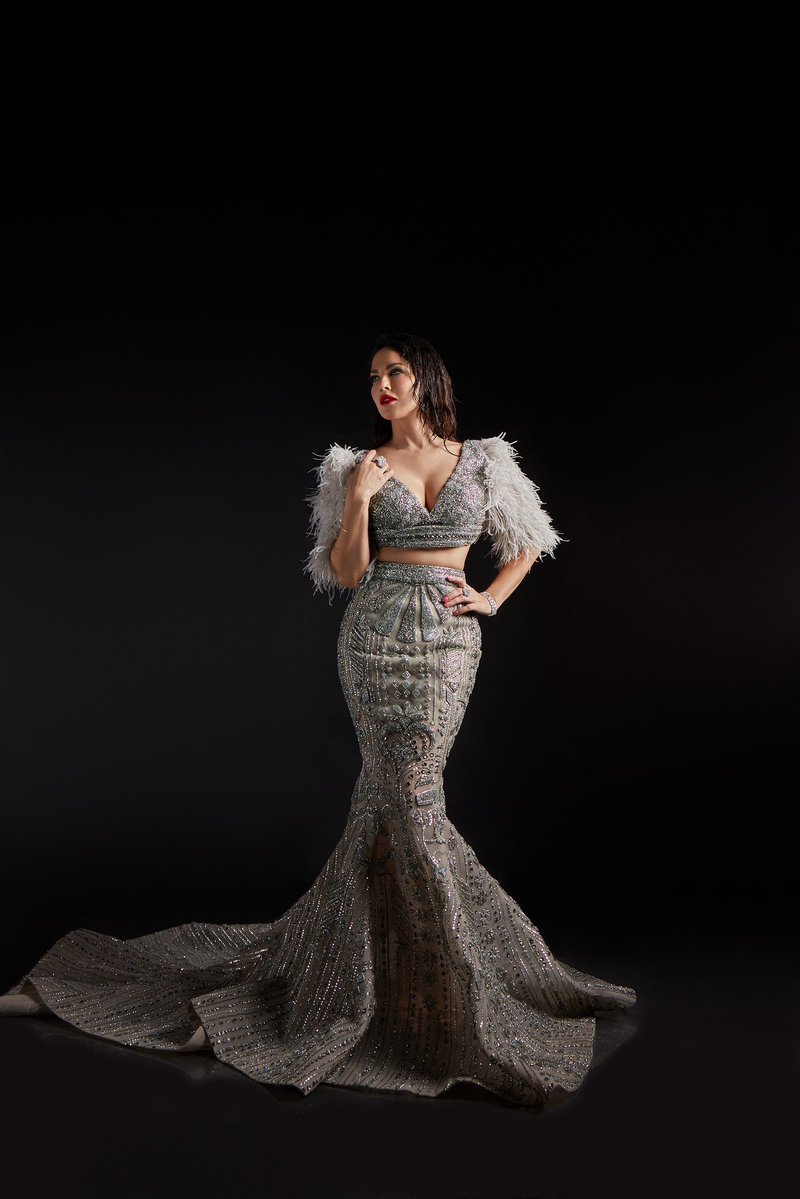 Sunny Leone looks dazzling and glamorous in her sexy crop-top with deep neckline and matching long skirt