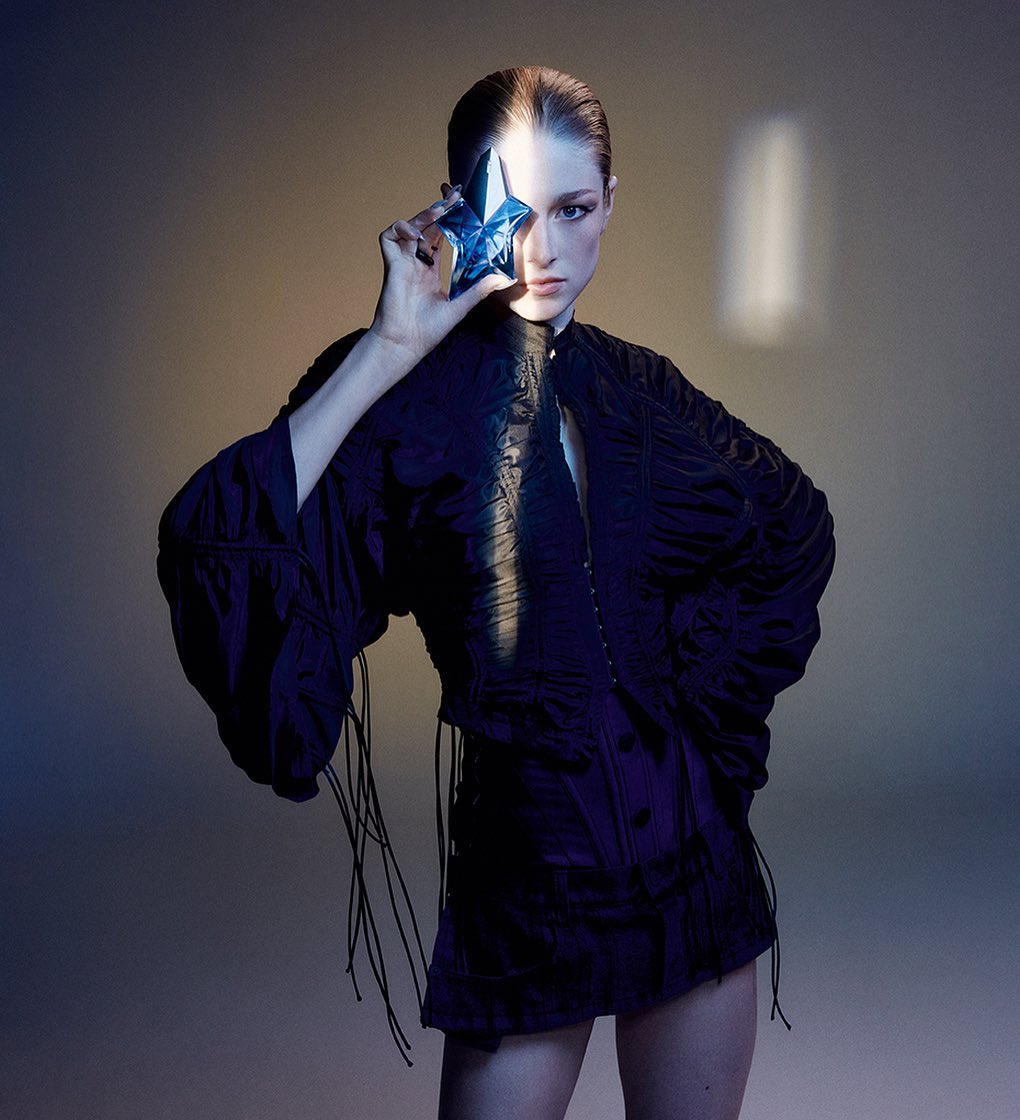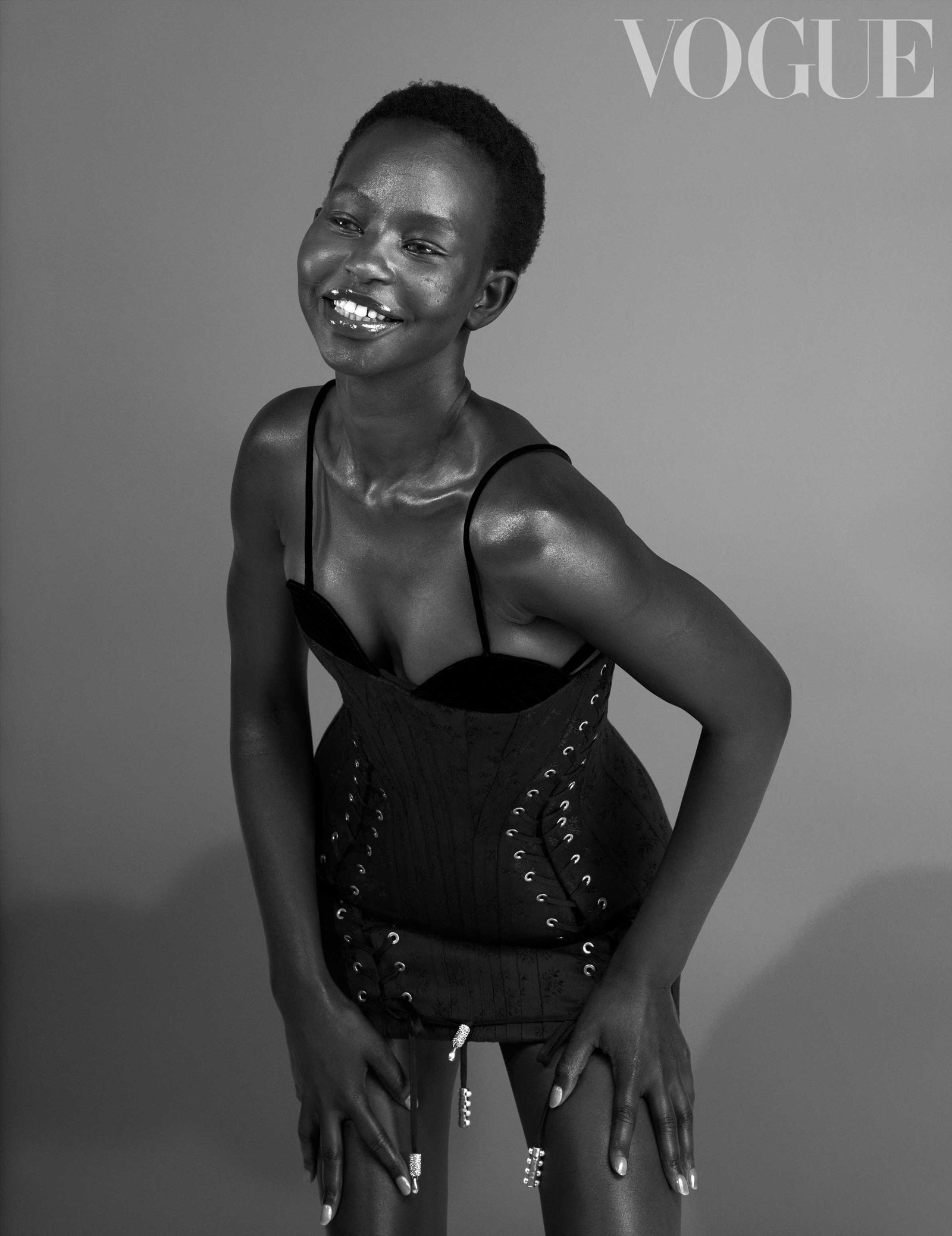 Aweng Chuol wears corset dress with rhinestone embellishment, Schiaparelli
