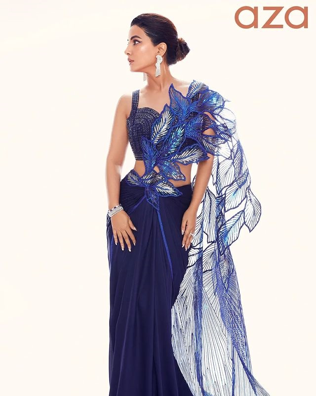 Hina Khan looks flawless in the blue saree with the designer pallu