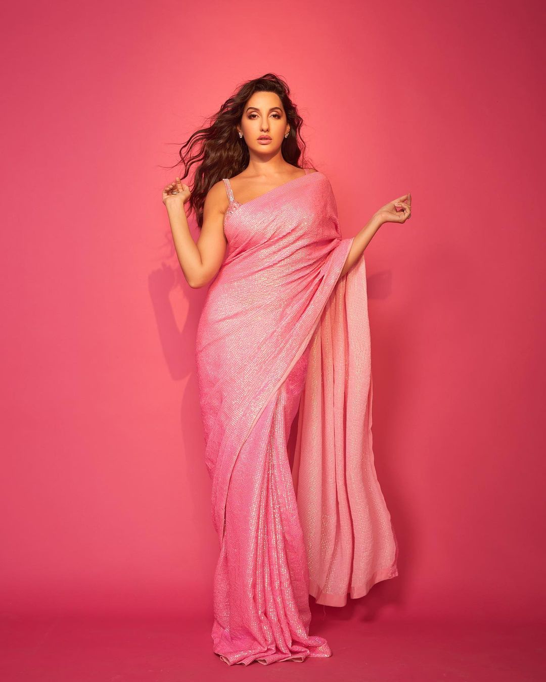 Nora Fatehi looks sexy in the sequinned pink saree