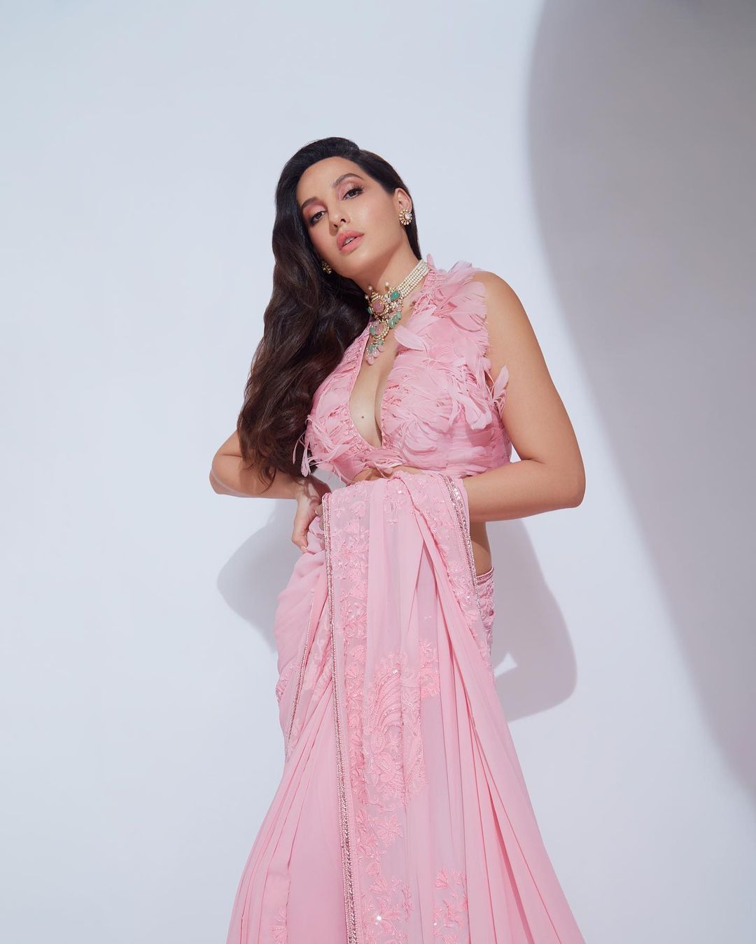 Nora Fatehi pairs the saree with a deep-neck blouse