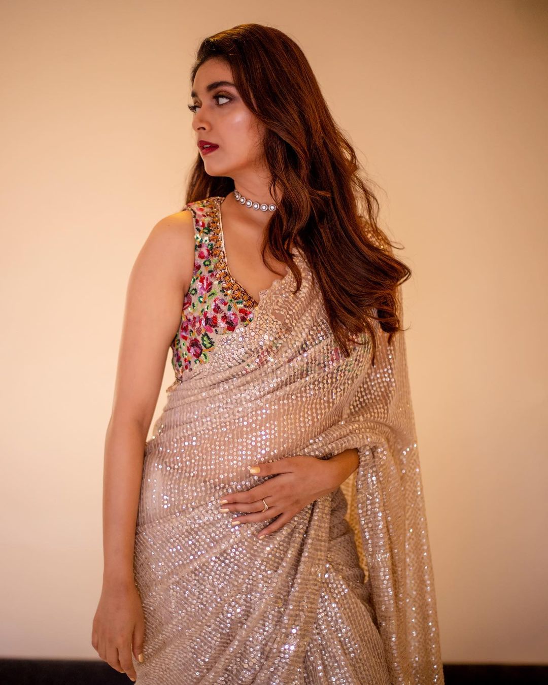 Keerthy Suresh is making heads turn in a sequinned saree and floral blouse