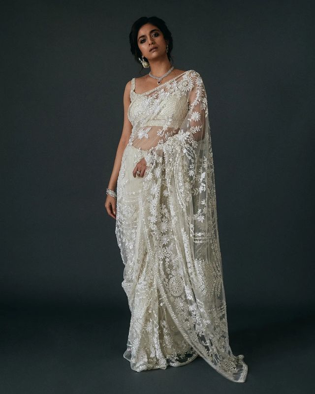 Keerthy Suresh is a sight to behold in a sheer sequinned saree