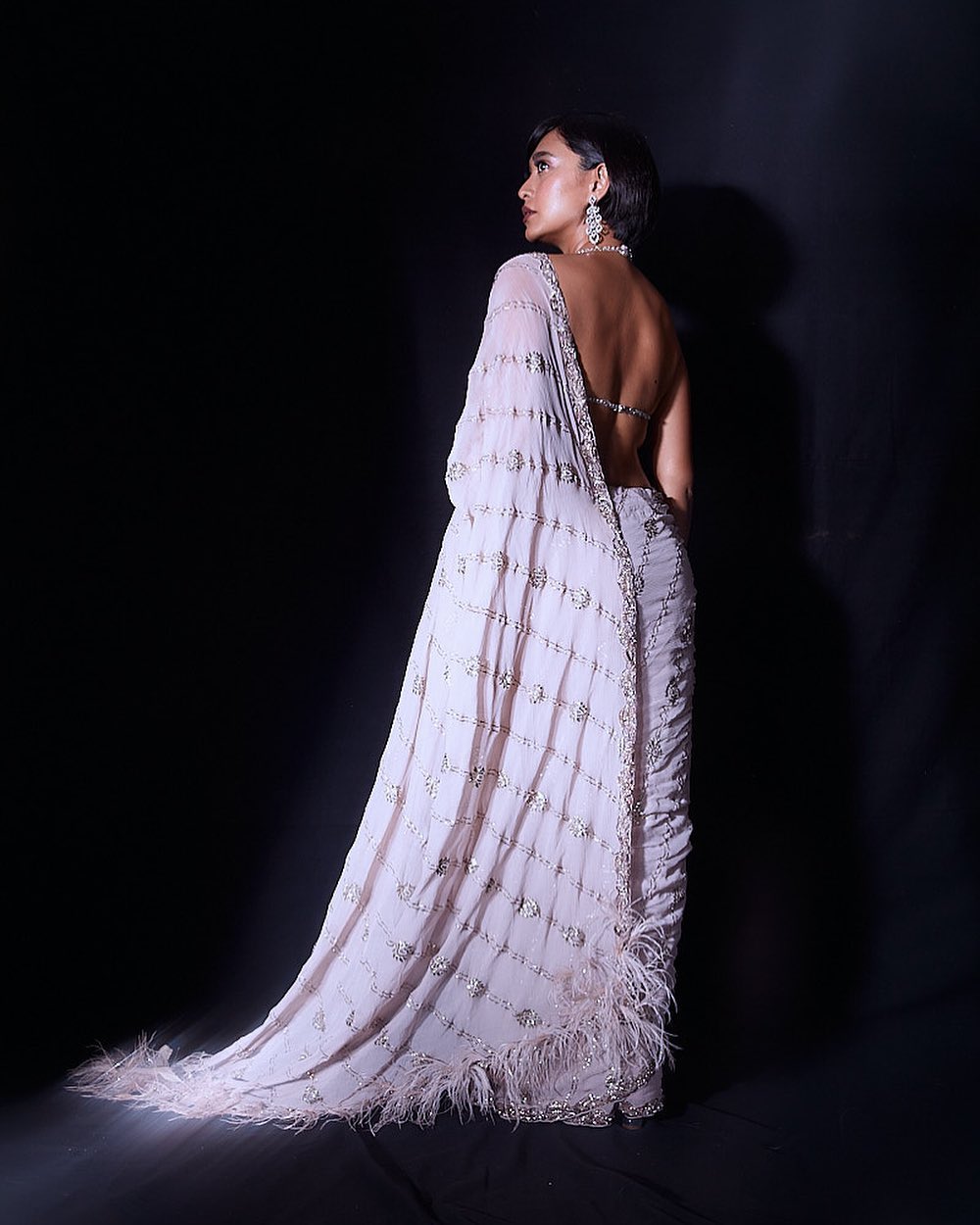 Sayani Gupta looks sensuous in the grey embellished saree.