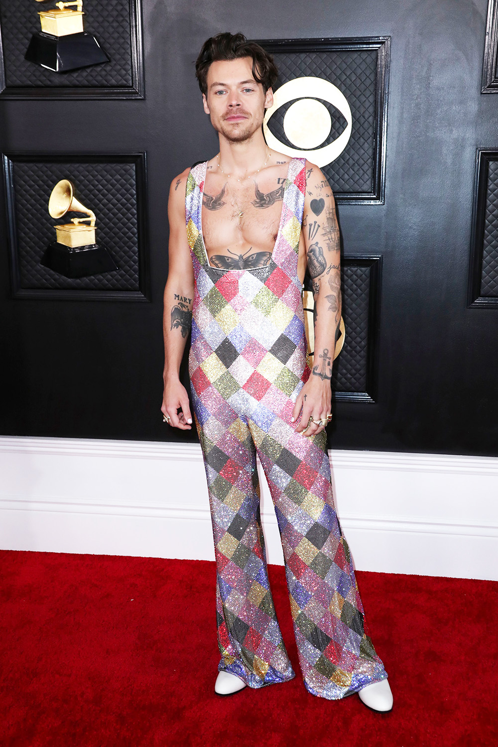 Harry Styles wore this bright colored sequin patterned Egonlab jumpsuit with no shirt underneath at the 2023 Grammy Awards