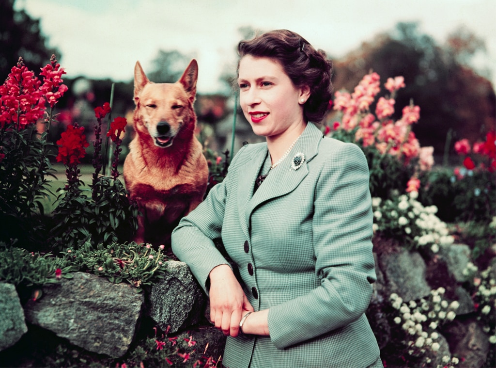 Queen Elizabeth II Majesty visits Balmoral Castle with one of her dogs in 1952.