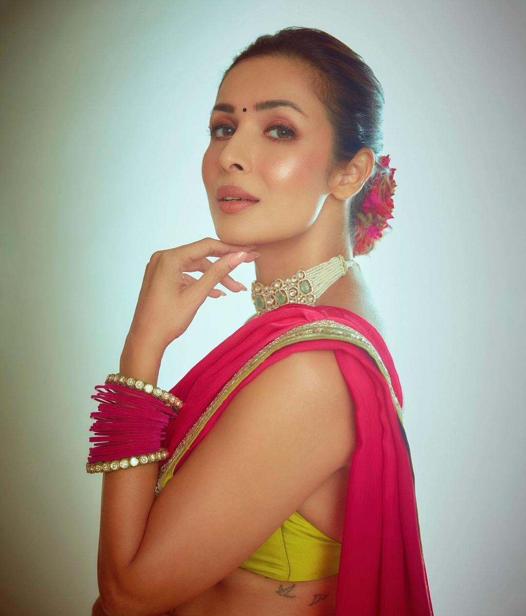 • Malaika Arora accessorises her ethnic look with a diamond choker and pink bangles on just one wrist