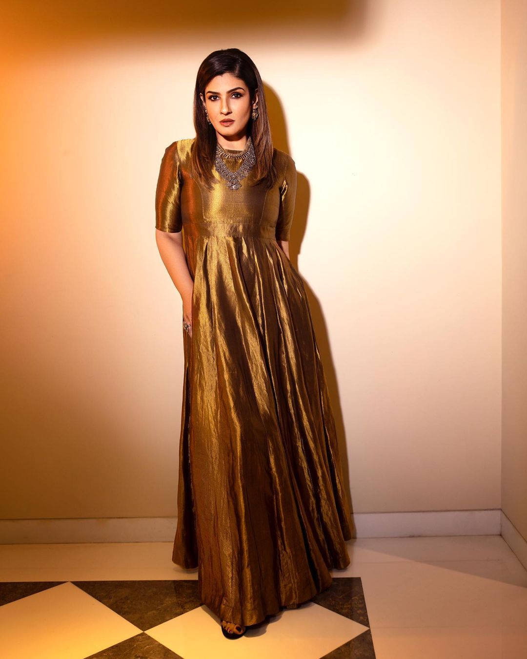 Raveena Tandon cuts a striking figure in the golden maxi dress