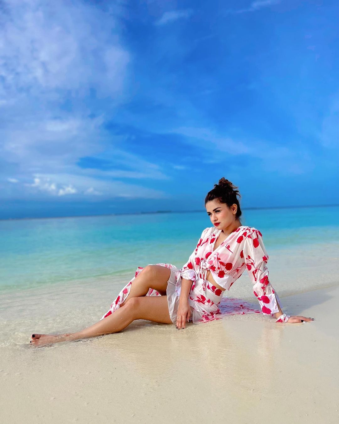 Avneet Kaur looks flirty in the ruffled bikini top and printed bottom