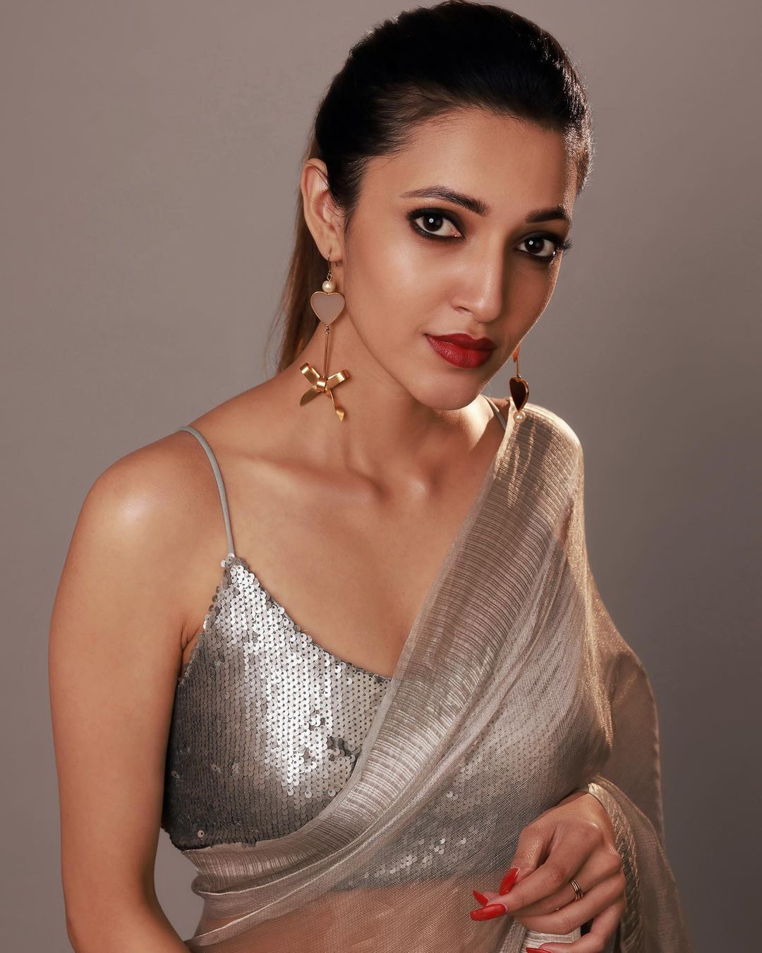 Neha Shetty looks stunning in the grey saree with the silver sequinned blouse
