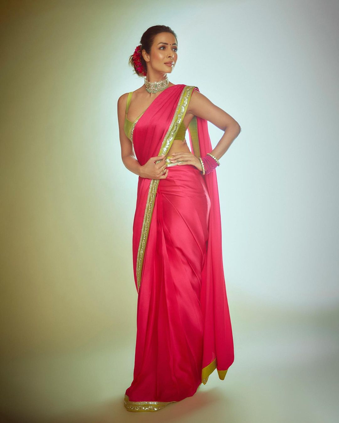 Malaika Arora is the epitome of grace and elegance in a gorgeous pink saree with green and silver borders