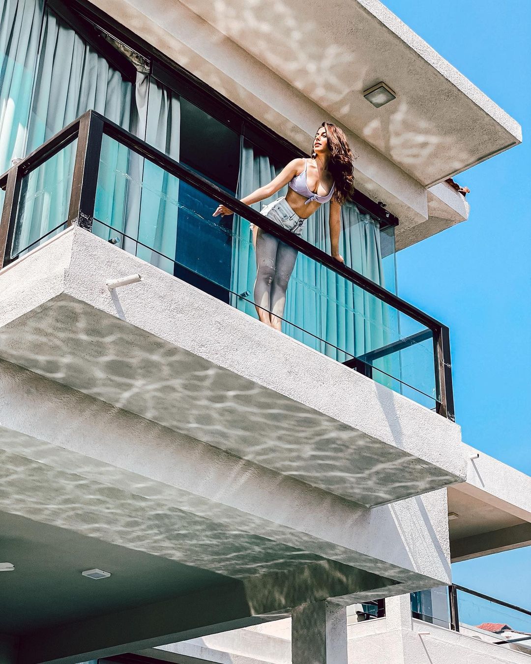 • Alaya F shows off her cleavage as she leans on a balcony in a sexy blouse paired with denim shorts