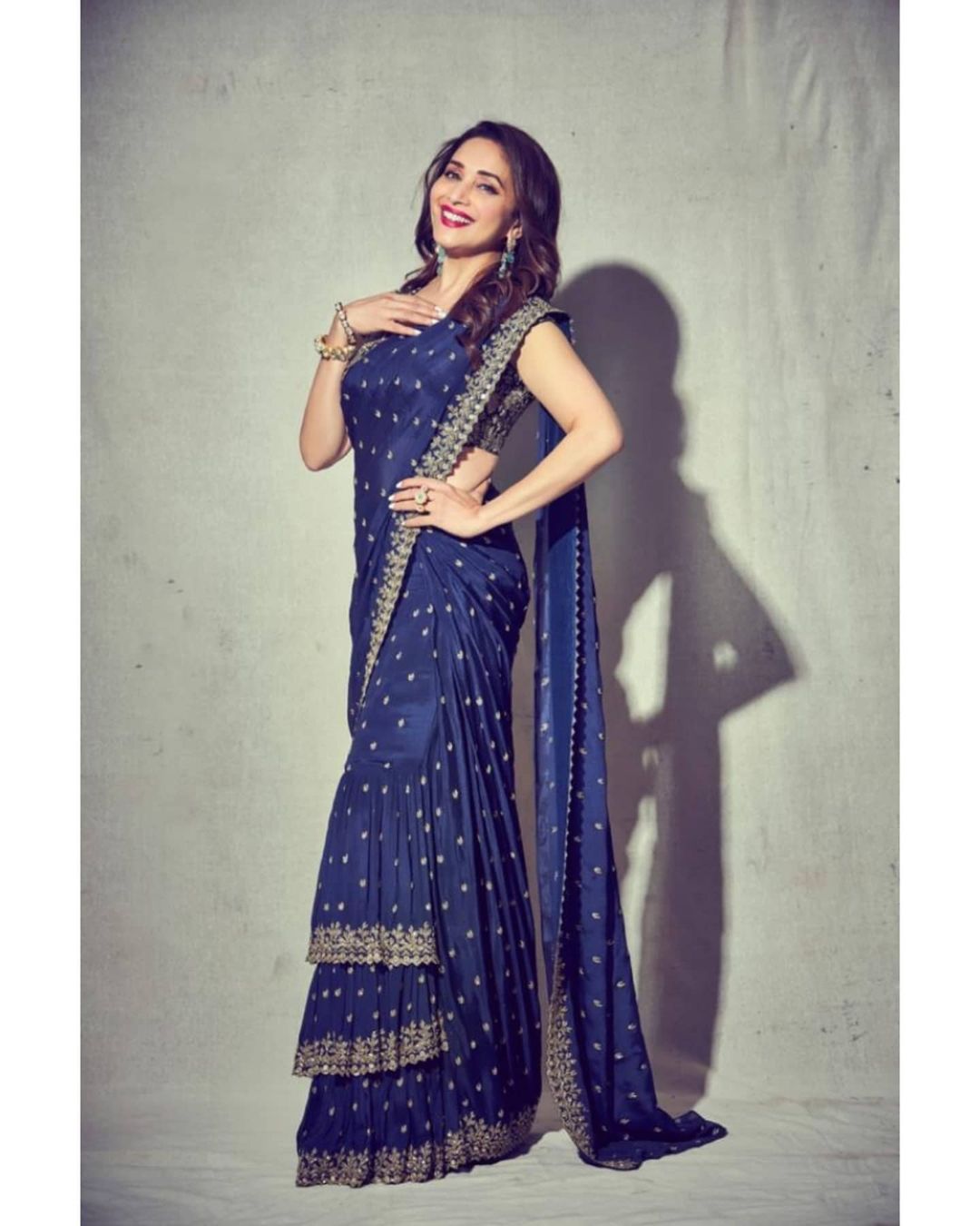 • Madhuri Dixit keeps it playful in the stitched tiered saree