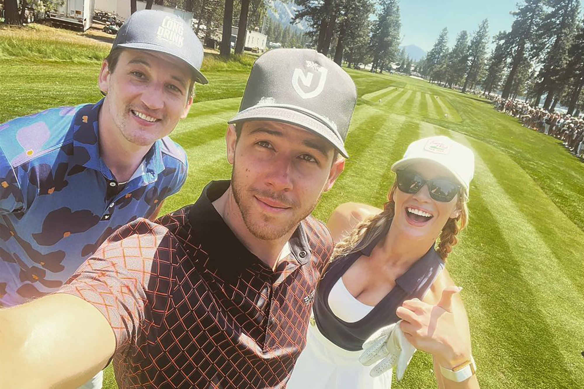 HAPPY GILMORES: It's just another day on the golf course for Paige Spiranac, but Miles Teller (left) and Nick Jonas make sure to crash the par-tee in style.