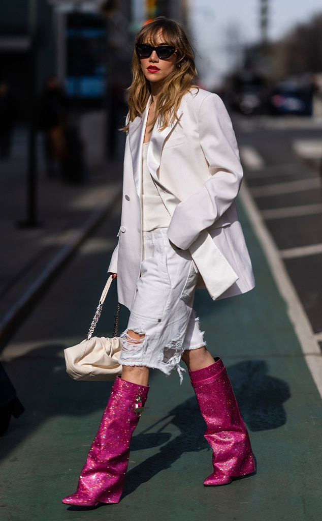 Businesswoman and reality star Kim Kardashian charms in a bright pink two-piece, jacket