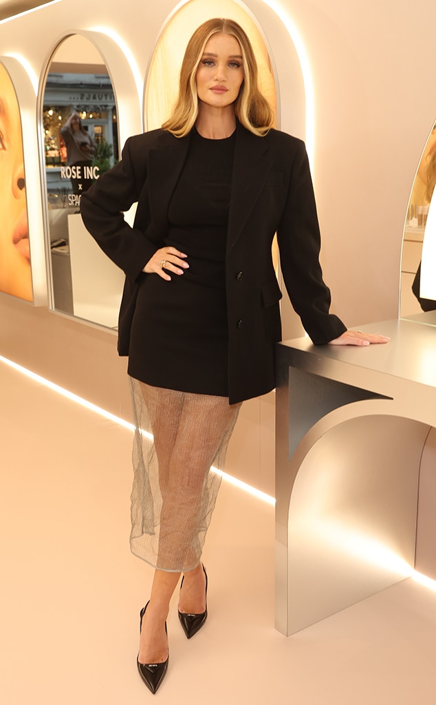 • Model Rosie Huntington-Whiteley rocks a black dress with a silver chiffon skirt paired with a blazer and pointed heels at the Rose Inc Pop up in London.