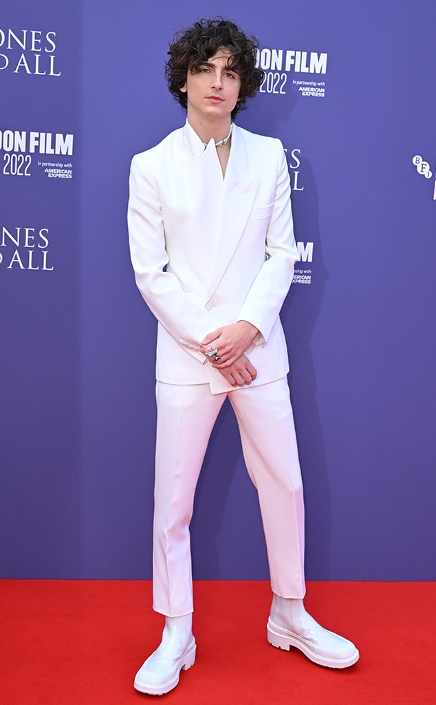 • Actor Timothée Chalamet wows in a white slim suit and platform boots at the Bones & All premiere during the 66th BFI London Film Festival.