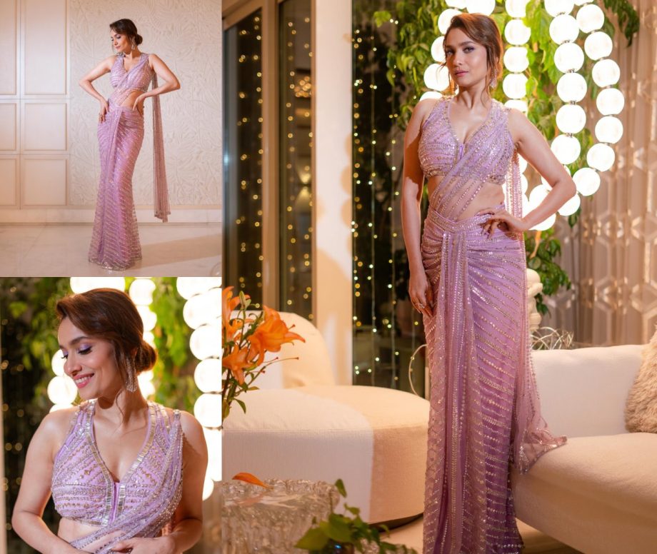 Ankita Lokhande looks gorgeous in a classic drape saree with a sequin all overwork and a dropped-end piece, often featuring a minimalistic design on elegant draping.