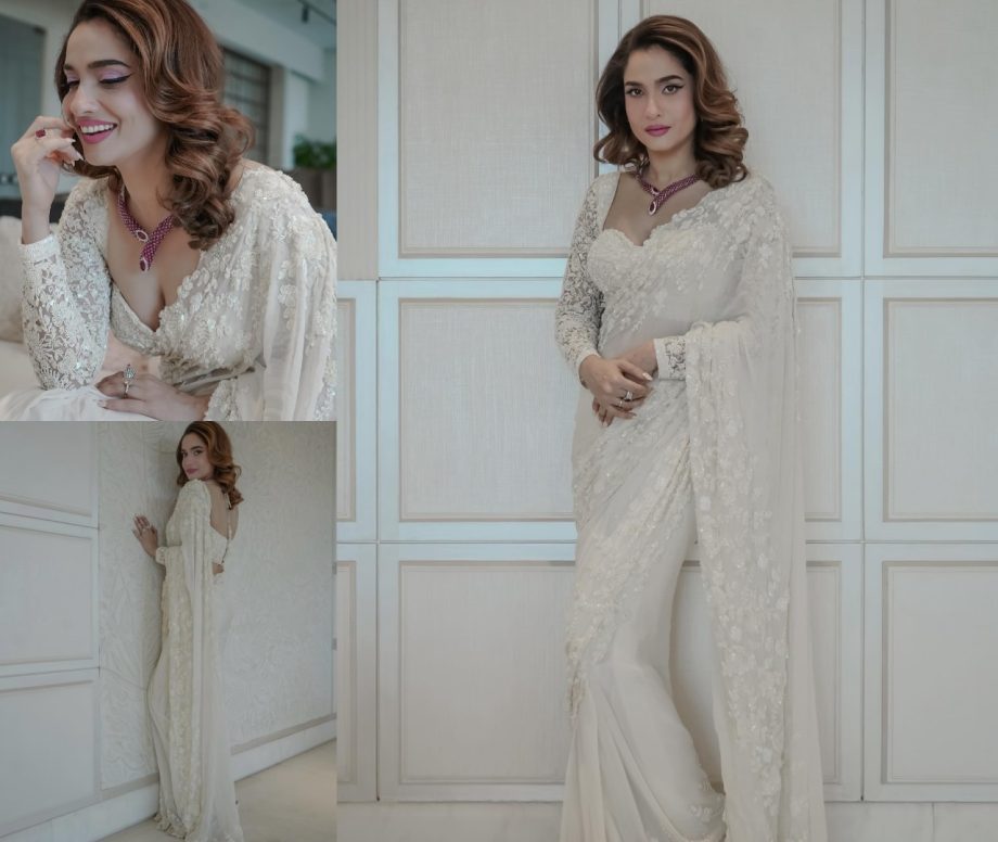 Ankita Lokhande is in a dazzling white saree with a floral work finish. It is often adorned with minimalistic embroidery and studded embellishments for a glamorous look.