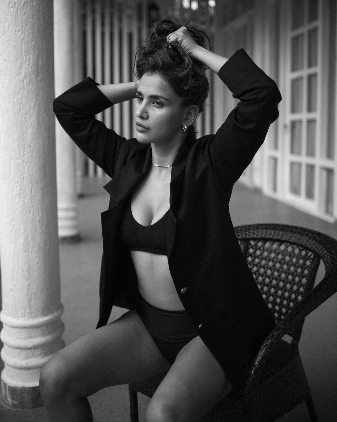 Aisha Sharma looks chic in the black bikini worn underneath a blazer