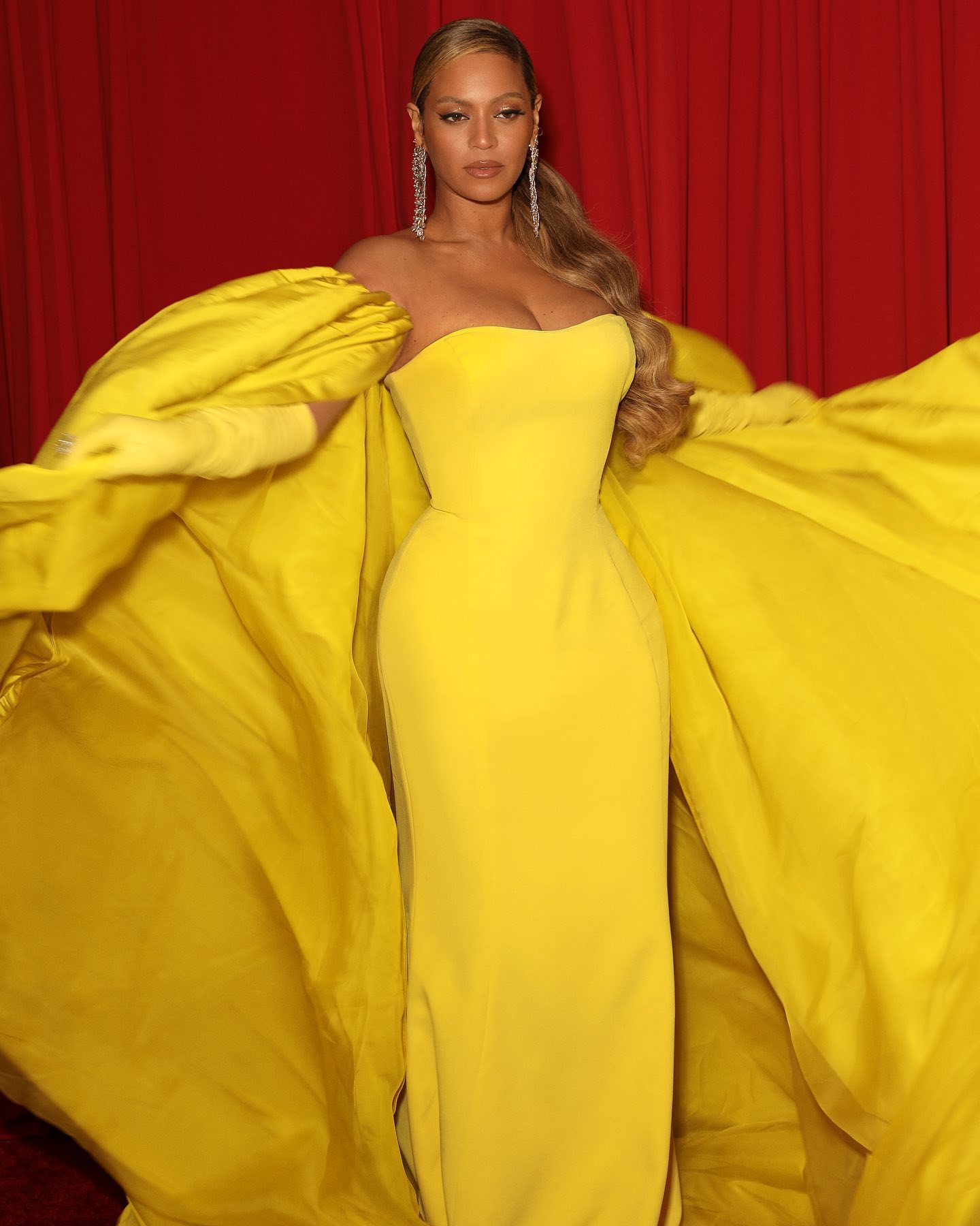 Beyonce looked stunning in a strapless plunging dress with a bronze corset top & metallic silver skirt with black leather over-the-elbow gloves at the 2023 Grammy Awards
