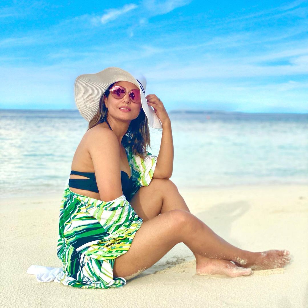 Hina Khan looks sultry in the black bikini and tropical-themed shrug