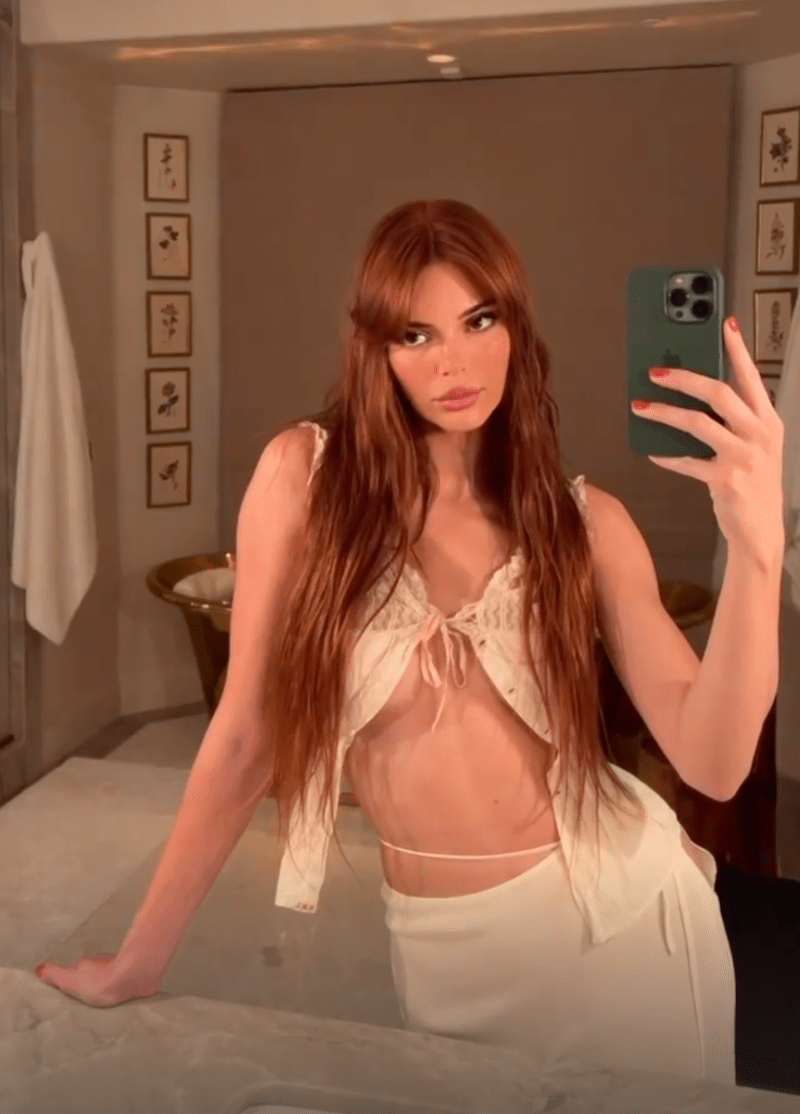 Kendall rocked a see-through white tank top in a mirror selfie during Milan Fashion Week