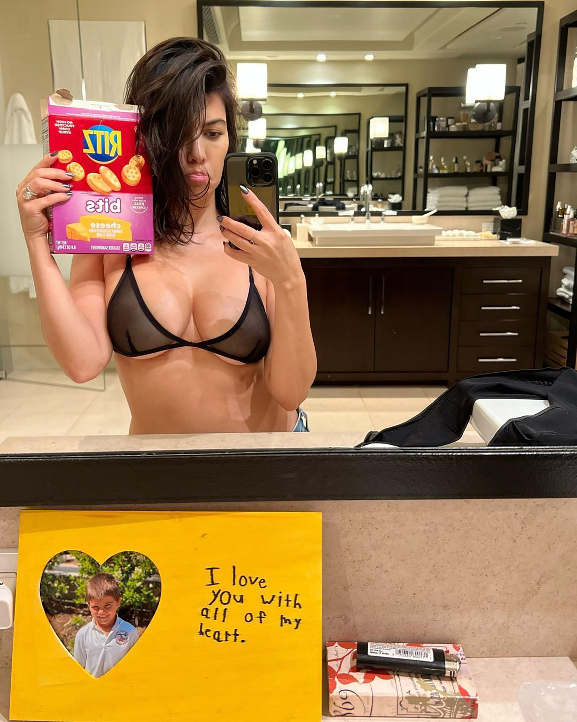 Kourtney Kardashian shares a sweet note from her son Reign while standing in her bra with a box of Ritz Bits.