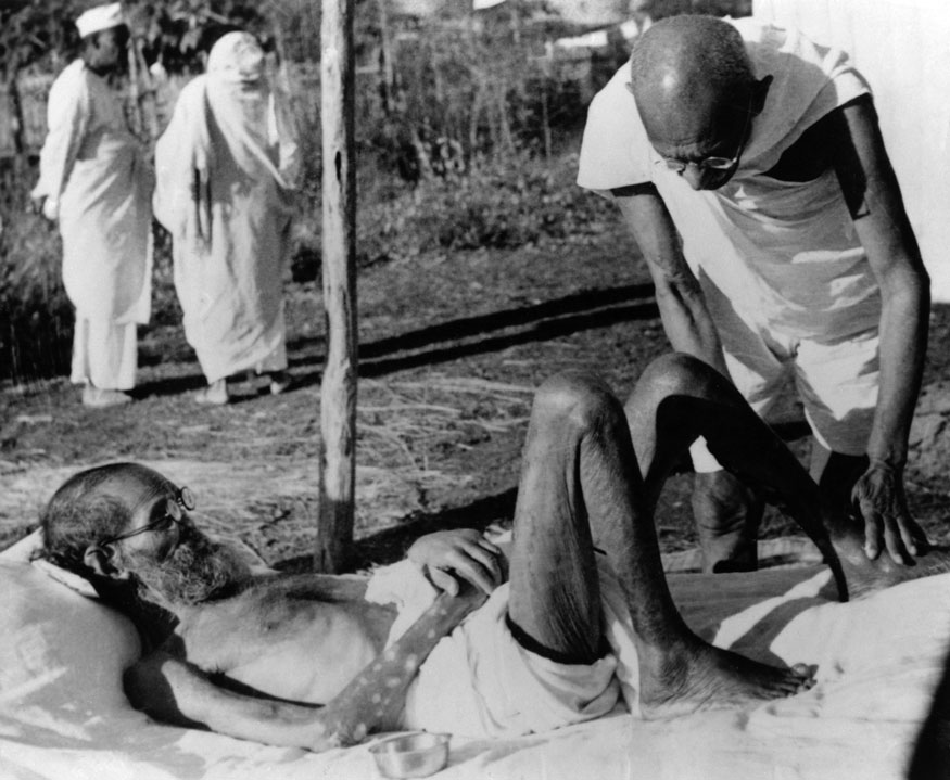 • Mahatma Gandhi photographed at the Sevagram Ashram.