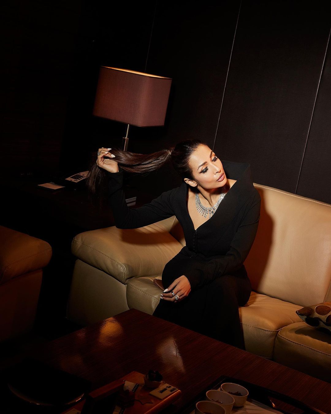 Malaika Arora keeps her hair tied into a messy updo that frames her face shape well. Smokey eye makeup, nude lips and red manicured nail complete her chic look. Malaika's wrist tattoo is also on display in this particular shot