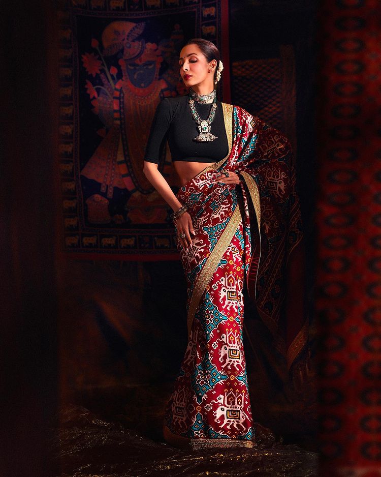 Malaika Arora looks majestic in the printed saree with the black blouse