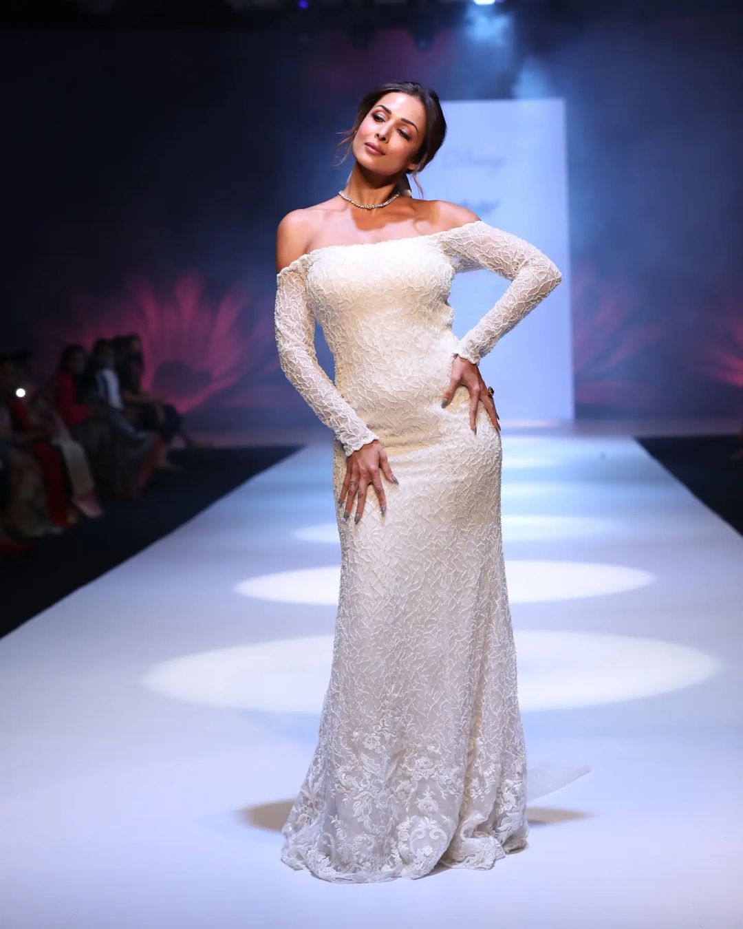 Malaika Arora looks exquisite as she walks the ramp in a white gown