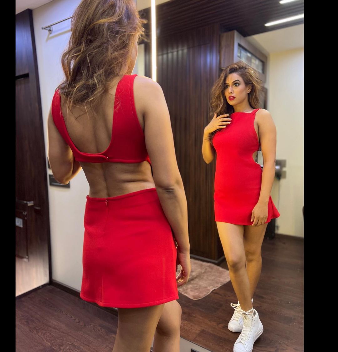 Nia Sharma looks fabulous in the cleavage-baring dress and bold red lips
