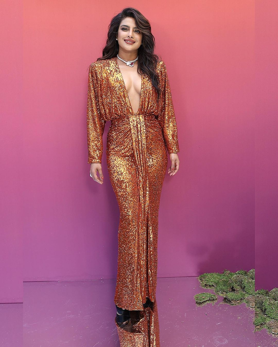 Priyanka Chopra wears a statement serpent neckpiece with a shimmering gown featuring a plunging neckline.