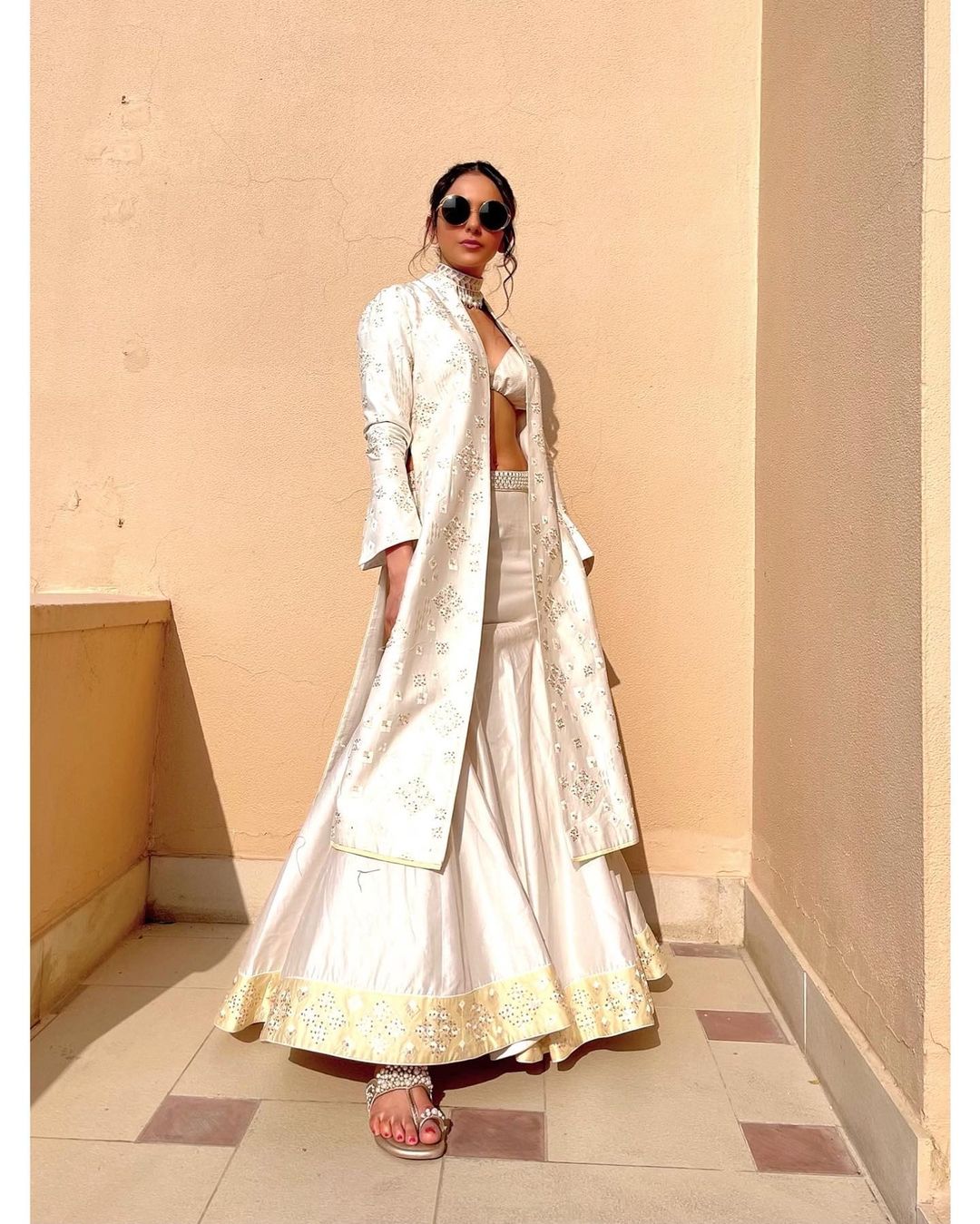 Rakul Preet Singh cuts a statusque figure in the white lehenga with a matching jacket
