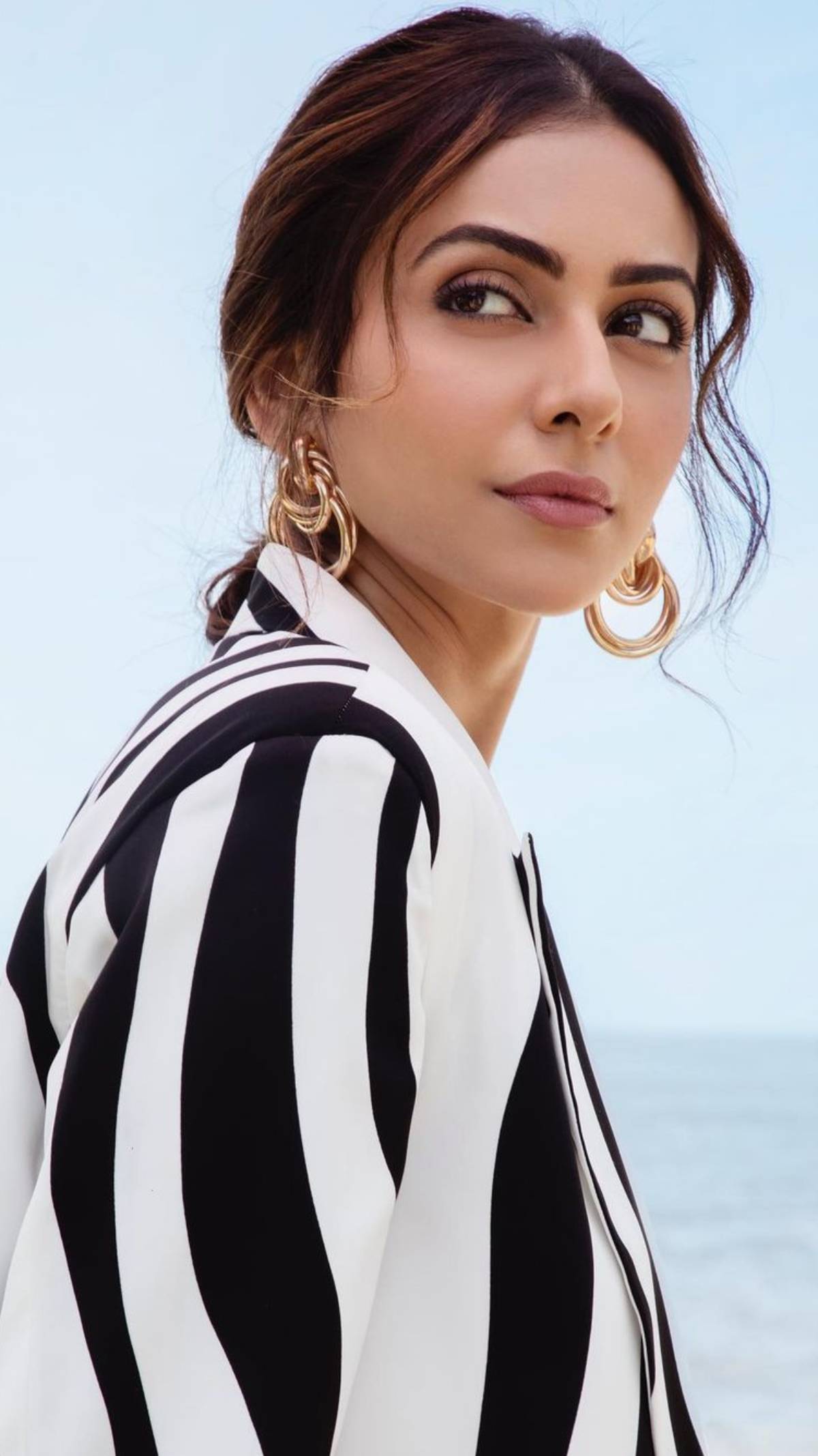 Rakul Preet Singh accessorises her look with a pair of golden earrings