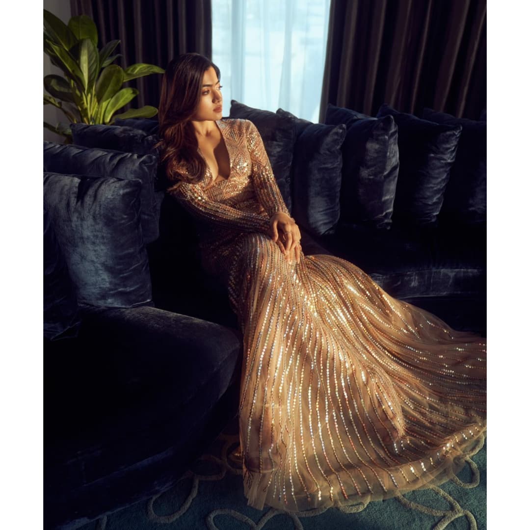 Rashmika Mandanna cuts a striking figure in the golden gown