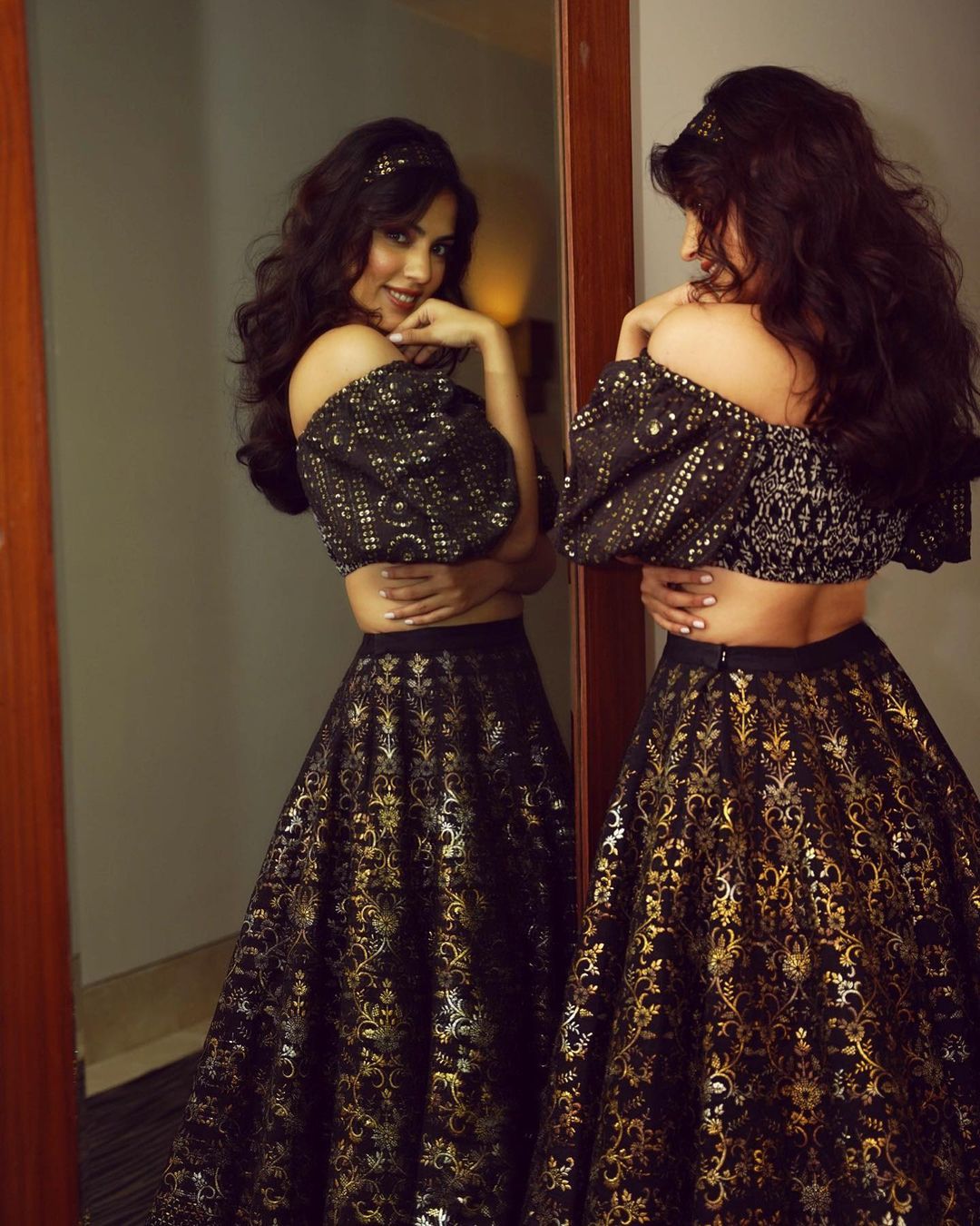 Rhea Chakraborty is a sight to behold in a shimmering black and gold lehenga