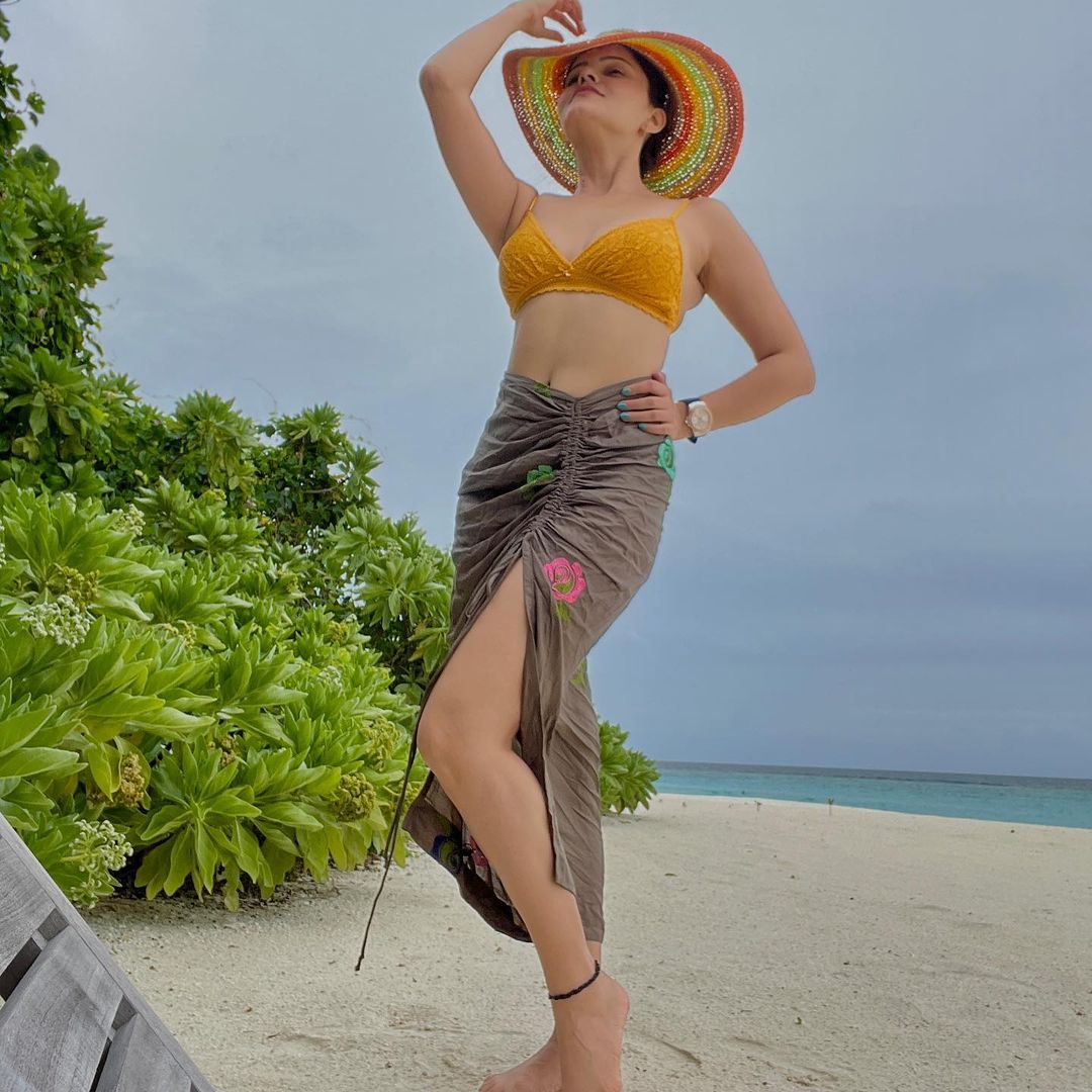 Rubina Dilaik looks flawless in the yellow bikini top and ruched sarong
