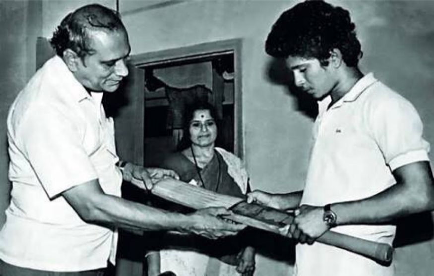Sachin Tendulkar shows his bat to father Ramesh as mother Rajni looks on