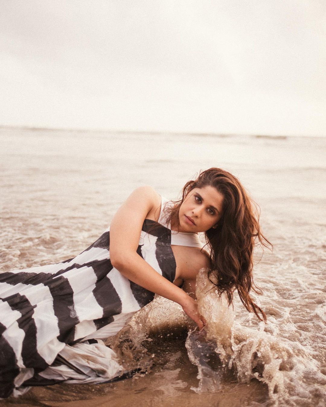 Sai Tamhankar strikes a bold pose as she dons a black and white dress at the beach