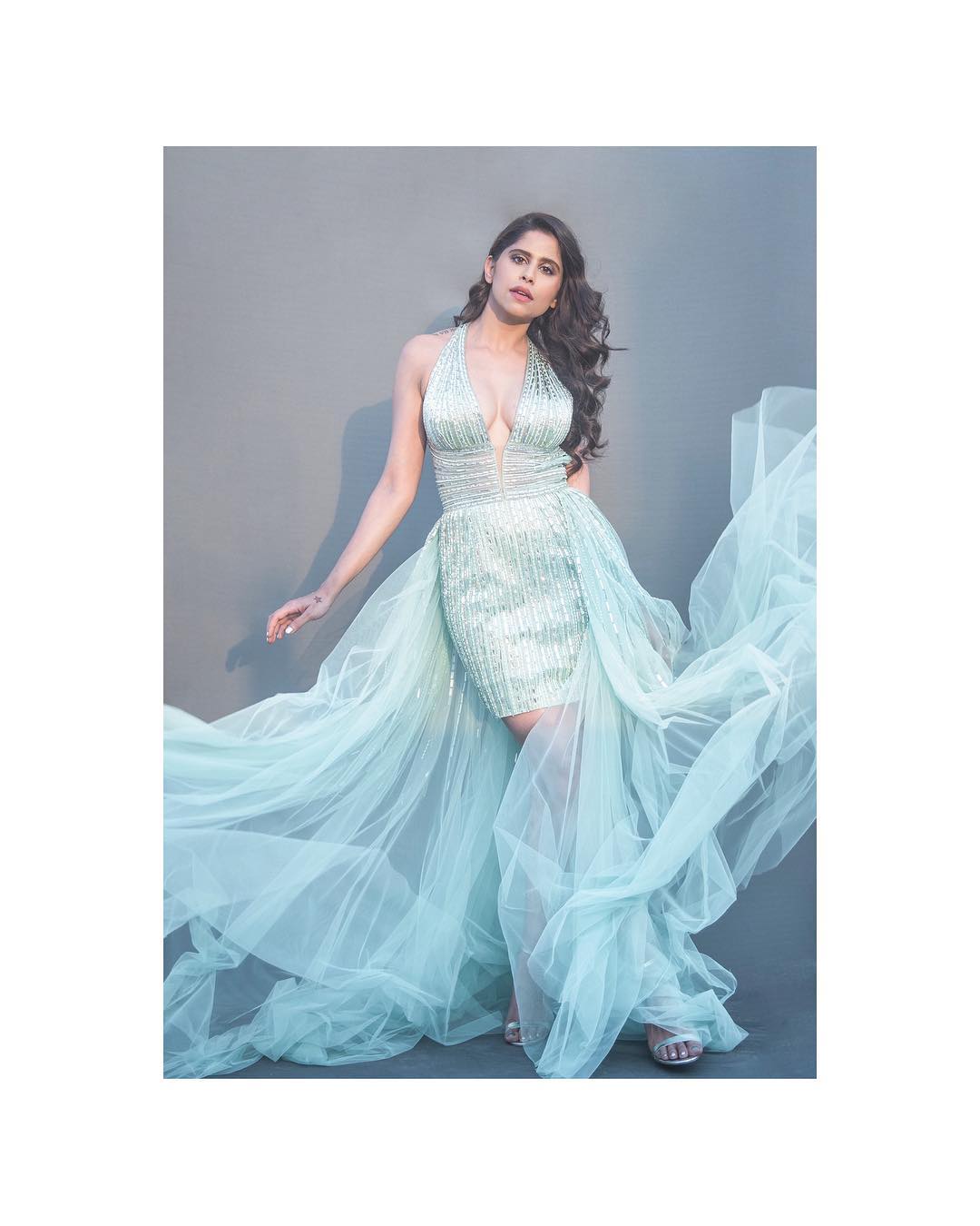 Sai Tamhankar stuns in a floor-length blue gown with ruffles on the side