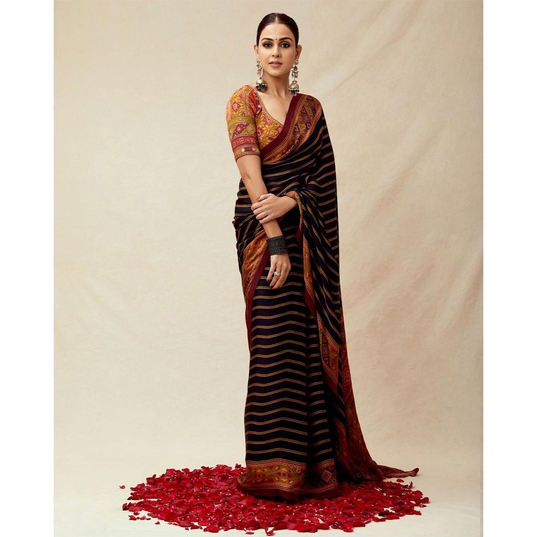 Genelia D'Souza's six yards of elegance comes in a jet black shade adorned with rusty orange stripes all over