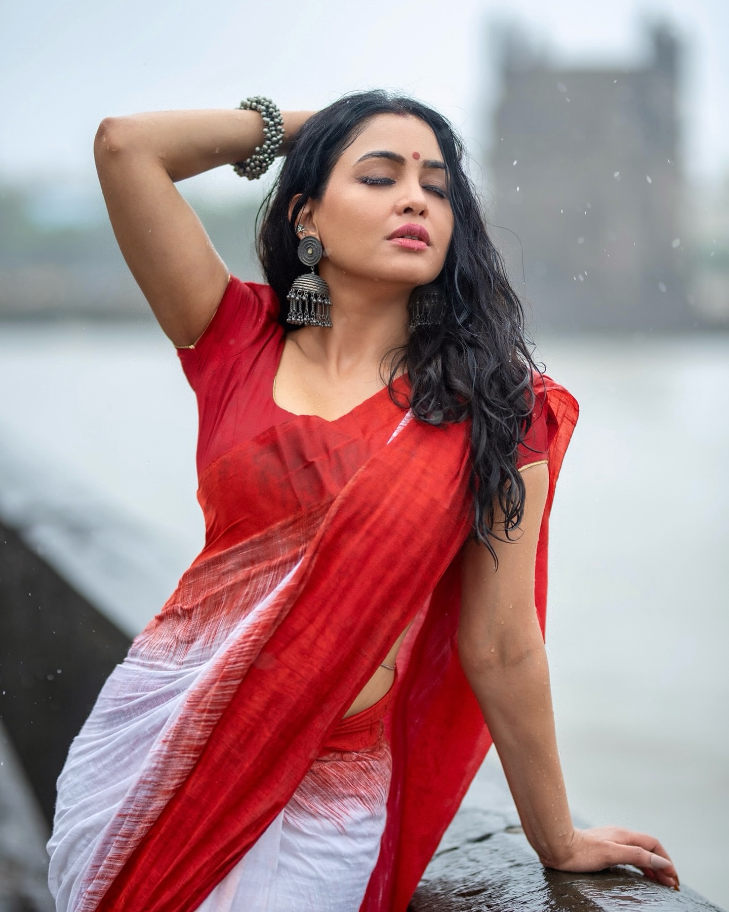 Shubhangi Atre, Indian TV actress, wearing red and white sari, Saranya Chaudhary.