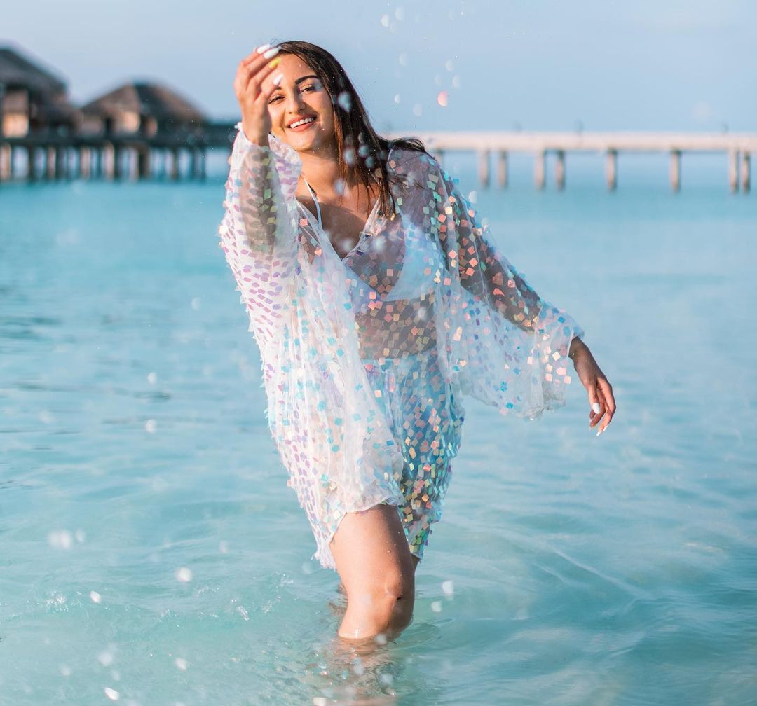 Sonakshi Sinha looks stunning in the whit bikini with a glittering shrug