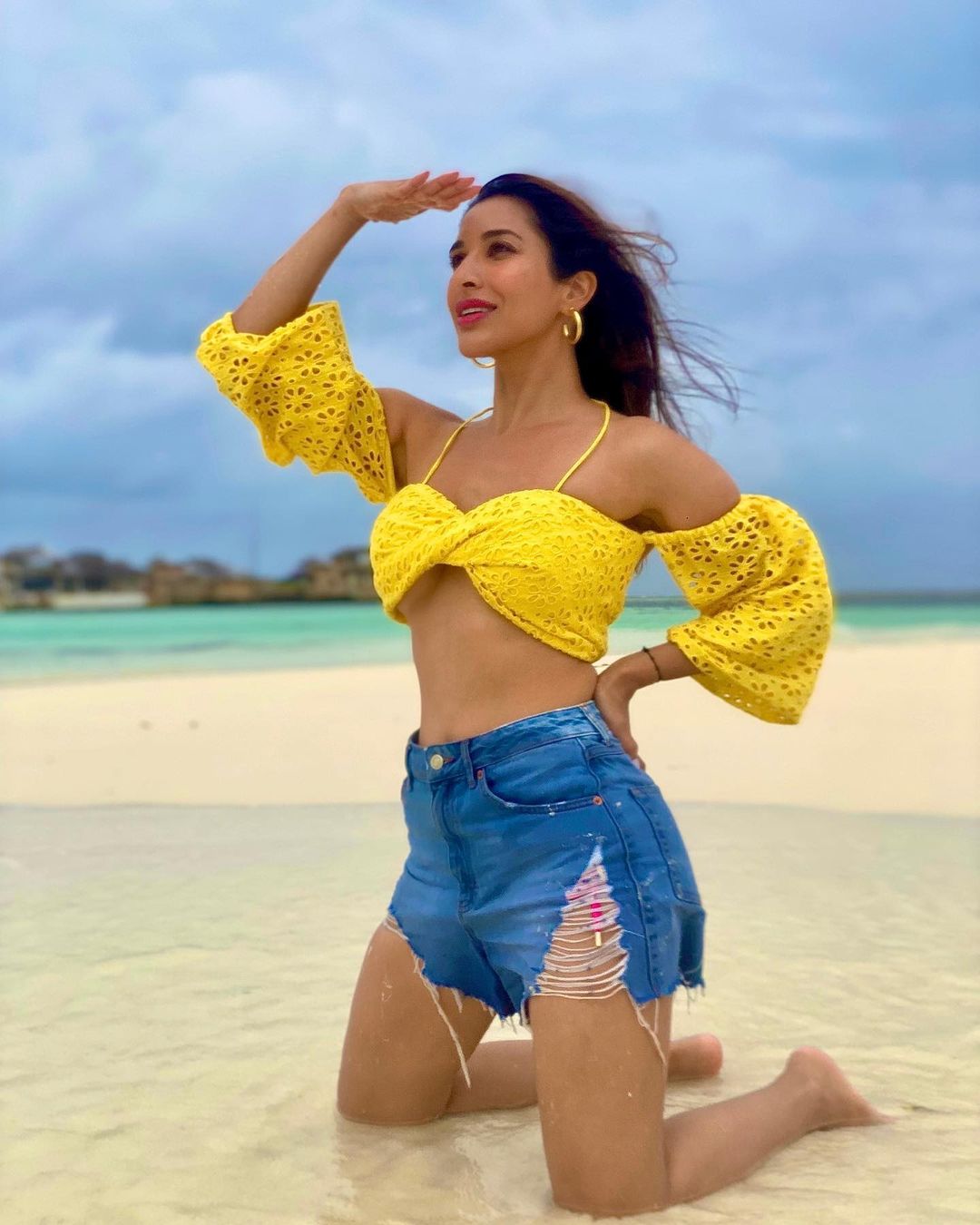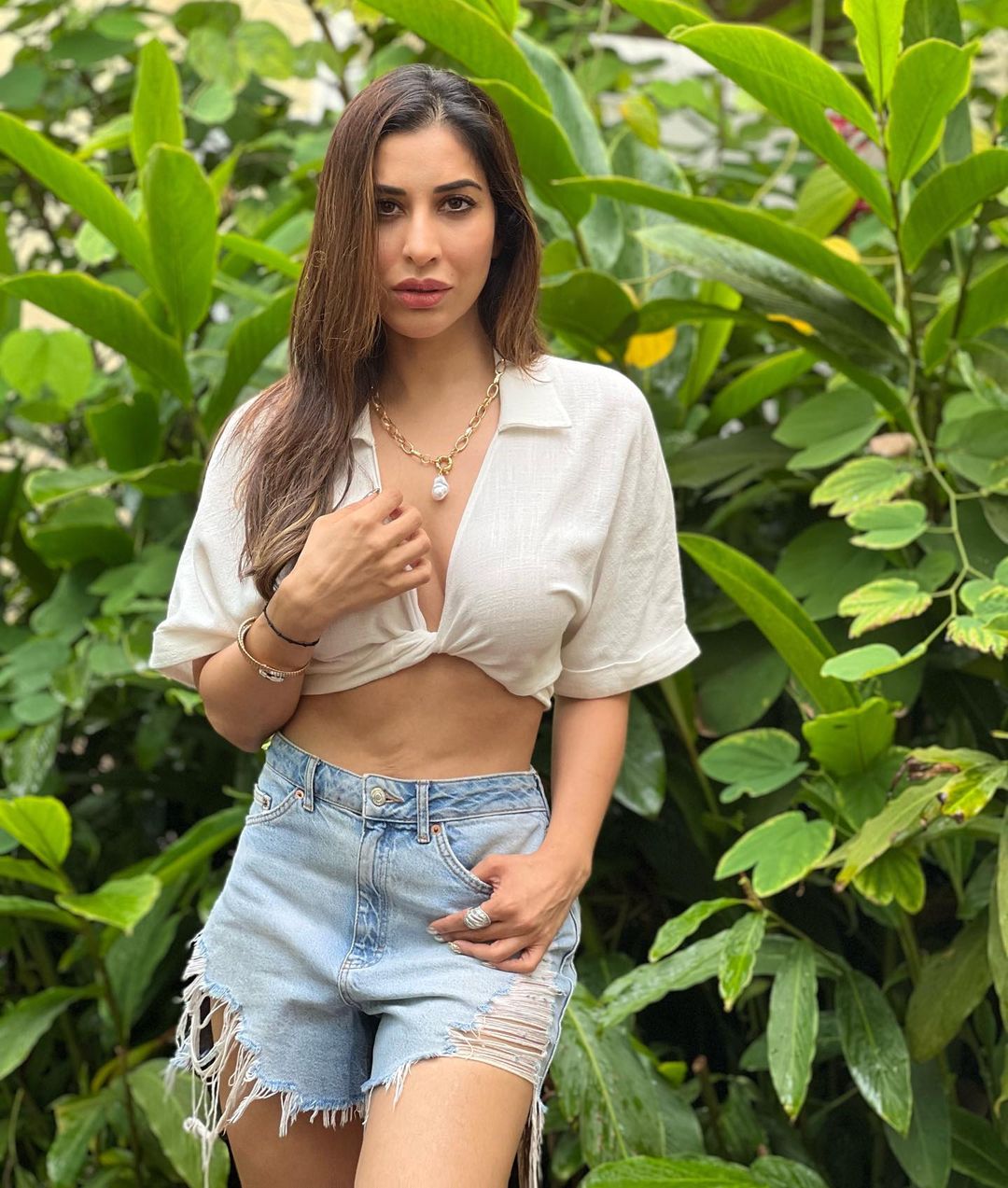 Sophie Choudry looks stunning in the yellow crop top and denim shorts
