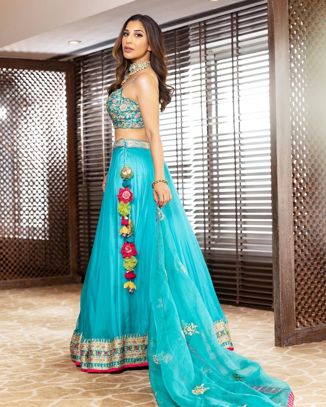 Sophie Choudry cuts a statusque figure in the blue tulle lehenga